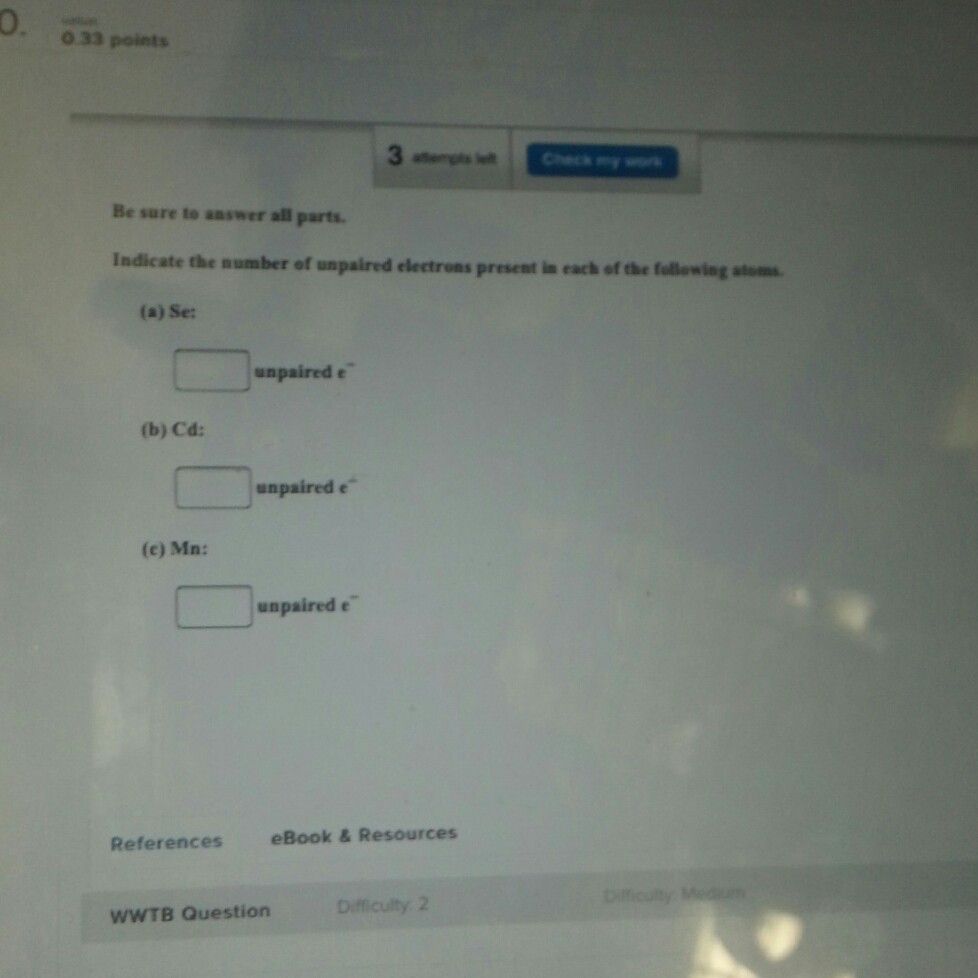 C r3+ is most stable in aqueous solution. The electronic configuration of various ions are given below: From the above configuration, we can see that four electrons in the t2g t 2 g orbital are paired, and one electron is unpaired. You have joined no matter what your level. Yes, the neutral atoms of elements in group 2 have no unpaired electrons. Nov 02, 2018 · if it is hard to visualize it, the best way to find the number of unpaired electrons is to draw out the orbitals of the valence shell to see the configuration. How do i find the number of electrons in an isotope? How can the number of electrons in an atom be determined? What determines the number of electrons in an atom? Therefore the number of unpaired electrons is one. Hence, 2 electrons are left on n and they are unpaired. If any electrons are left, they are unpaired. Since 1s can only hold 2 electrons, and p has 15,.